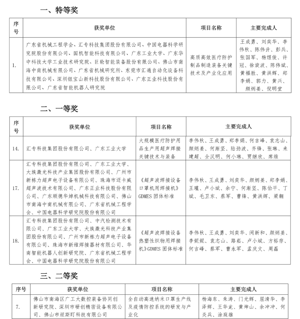 由我校等13家单位承担、王成勇教授为第一完成人的“高质高效医疗防护制品制造装备关键技术及产业化应用”成果荣获唯一特等奖;我校参与完成的“大规模医疗防护用品生产用超声焊接关键技术与装备”、“《超声波焊接设备 口罩机用焊接机》GDMES团体标准”及“《超声波焊接设备 热塑性织物用焊接机》GDMES团体标准”荣获一等奖。