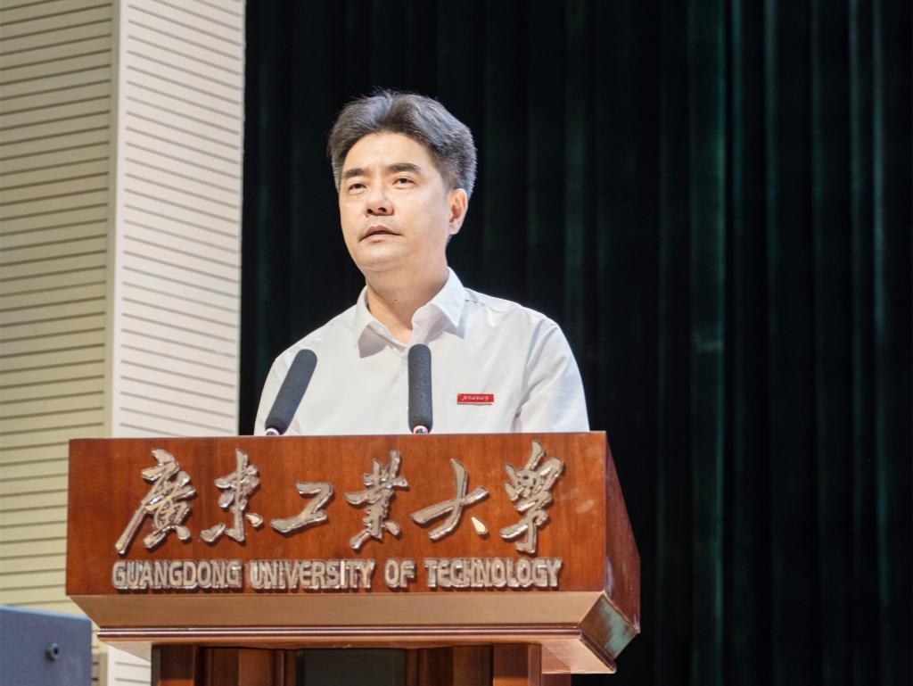 教师代表、先进制造学院化工与先进材料系主任、博士生导师易国斌教授发言。他饱含深情地说,能够作为新校区第一批教师代表,与大家共同见证揭阳市第一所本科高校开学这一历史时刻,很荣幸,很高兴,很激动!同学们作为揭阳校区的首批学生,不仅要完成大学学业,还肩负着校区精神塑造者和传承者的重要使命,作为老师的我们将有幸见证这一过程,全身心投入,帮助同学们完成好这一使命。对于大学四年如何度过,他送给新同学三个词:独立、主动、坚持。