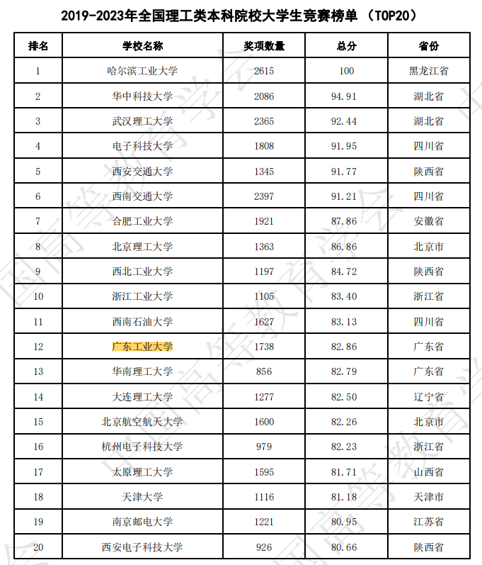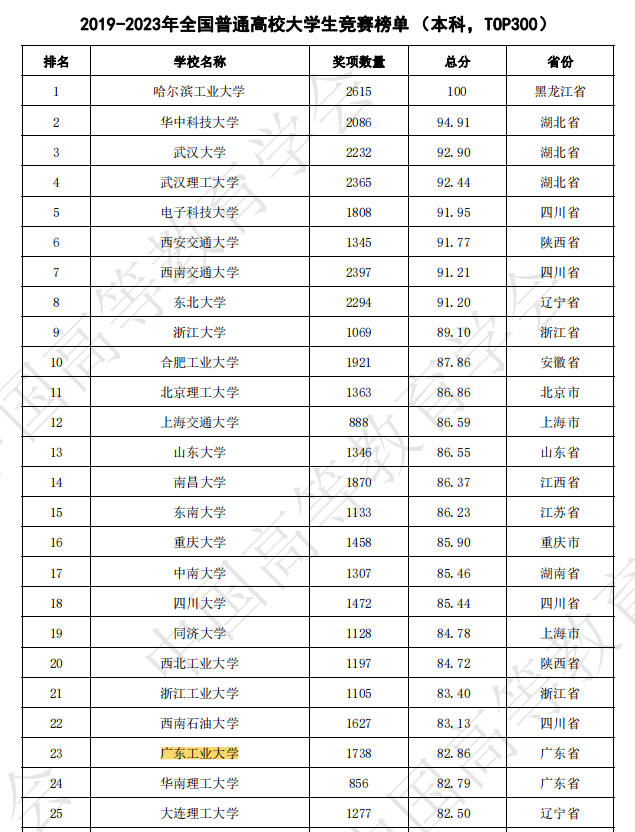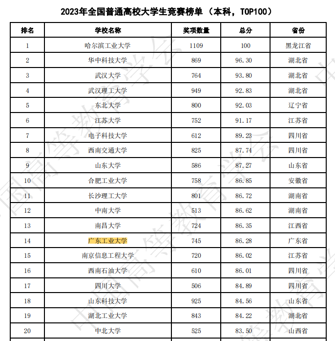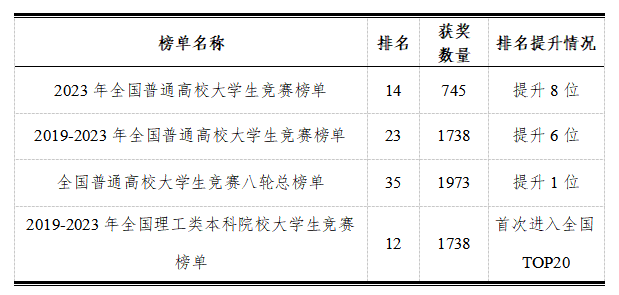 2024年3月22日,中国高等教育学会发布《2023全国普通高校大学生竞赛分析报告》,公布2023全国普通高校大学生竞赛榜单,我校在2023年全国普通高校大学生竞赛榜单中位列全国第14位,在广东省内继续保持第1,在单年度榜单中再创辉煌!同时发布的还有2019-2023年(5年)全国普通高校大学生竞赛榜单,我校位列第23位;在2019-2023年全国理工类本科院校大学生竞赛榜单中,我校位列第12位。
