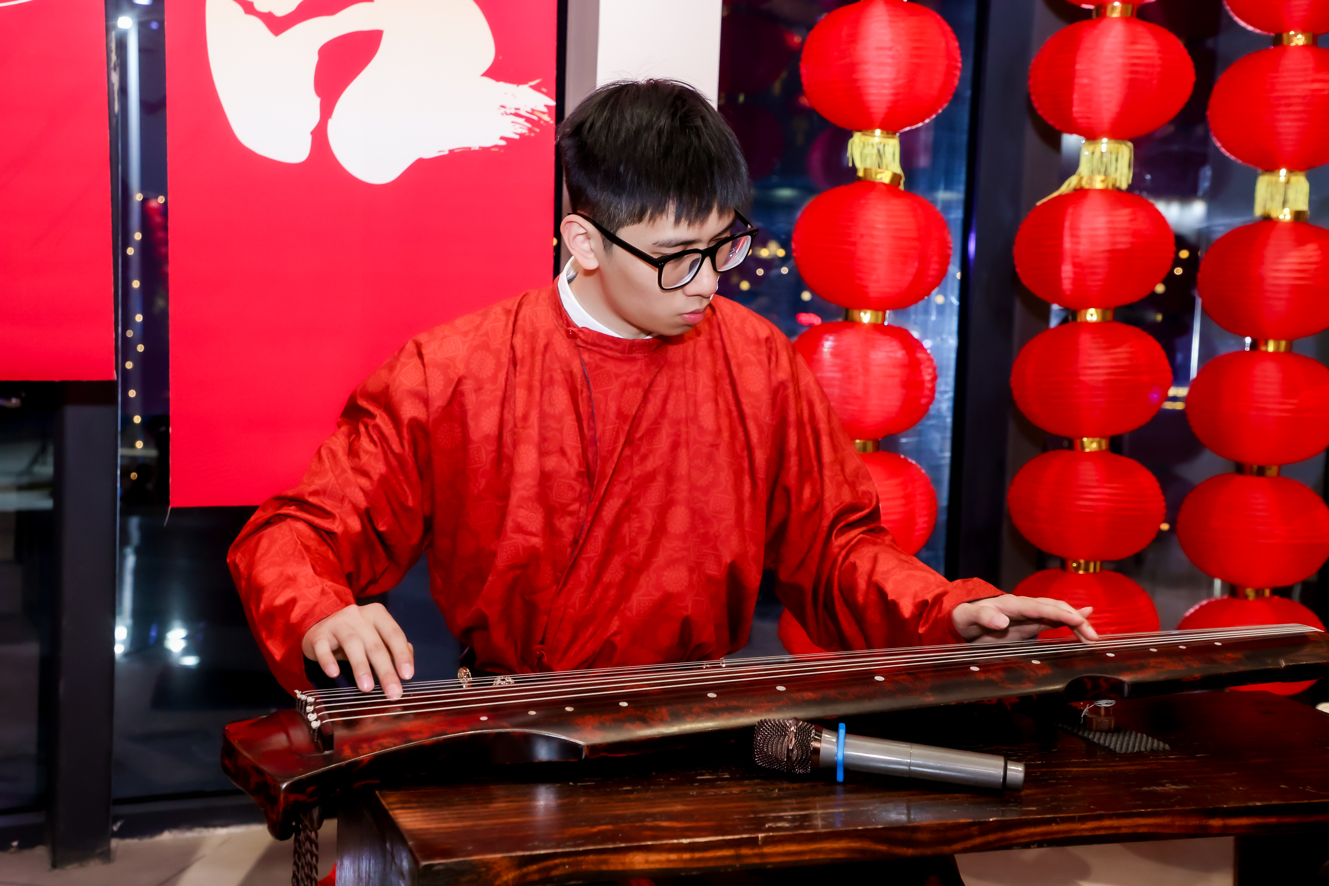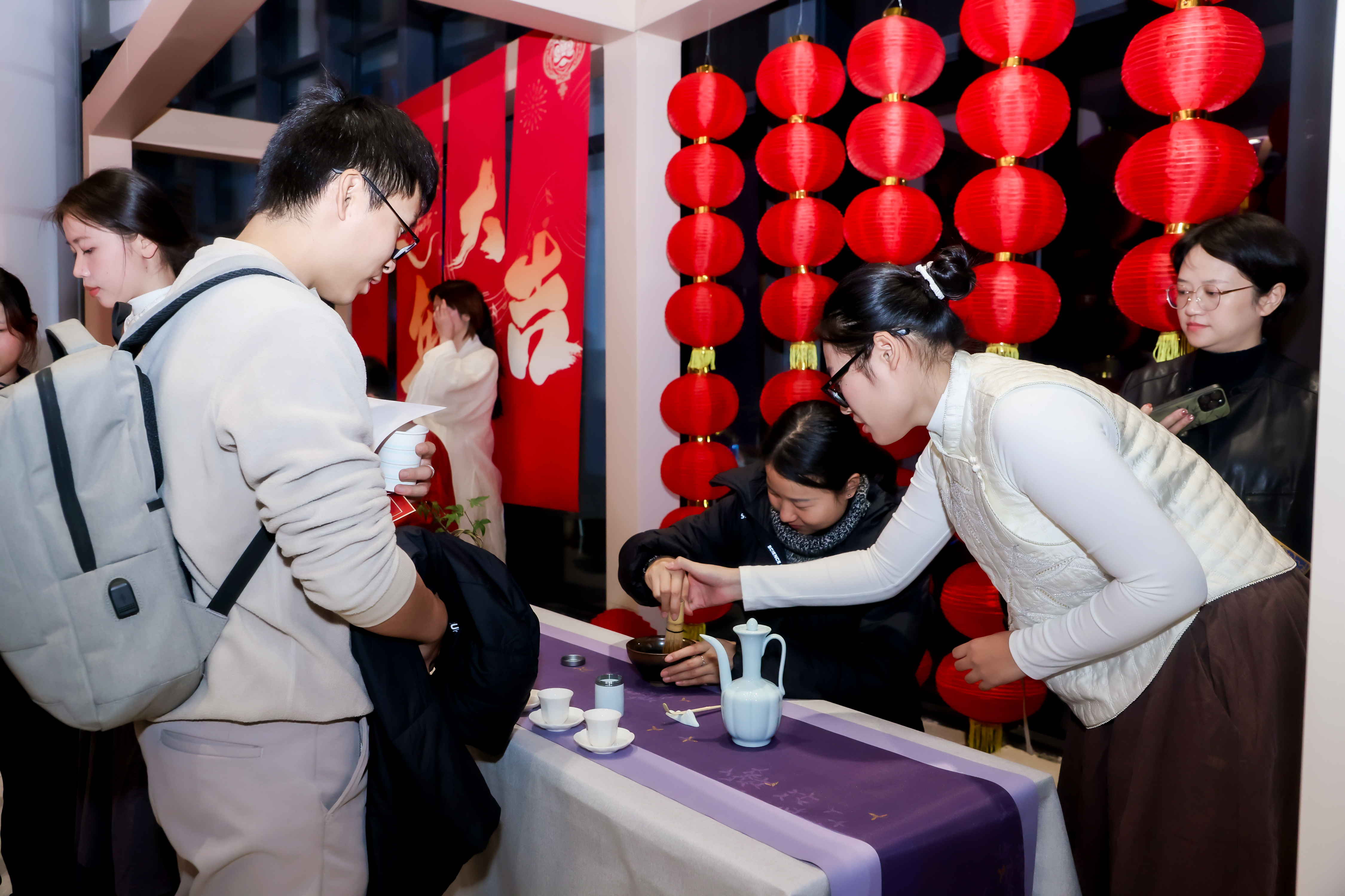 一同开幕的,还有中华优秀传统文化体验展示活动。文化活动中心演艺厅入口处的玻璃大厅内,中华优秀传统文化体验展示活动吸引了大批师生参与。古琴演奏、中国香道艺术、中国茶道艺术、书法现场挥毫写春联、送“福”字窗花……大厅被装点得年味十足,古琴的低吟仿佛在述说千年的文化传承,袅袅茶香弥漫在空气中。师生们排队领取春联与“福”字窗花,现场充满了欢声笑语。整个大厅洋溢着节日的温暖气息,也为随后的音乐会奏响了一曲充满文化底蕴的暖场乐章。