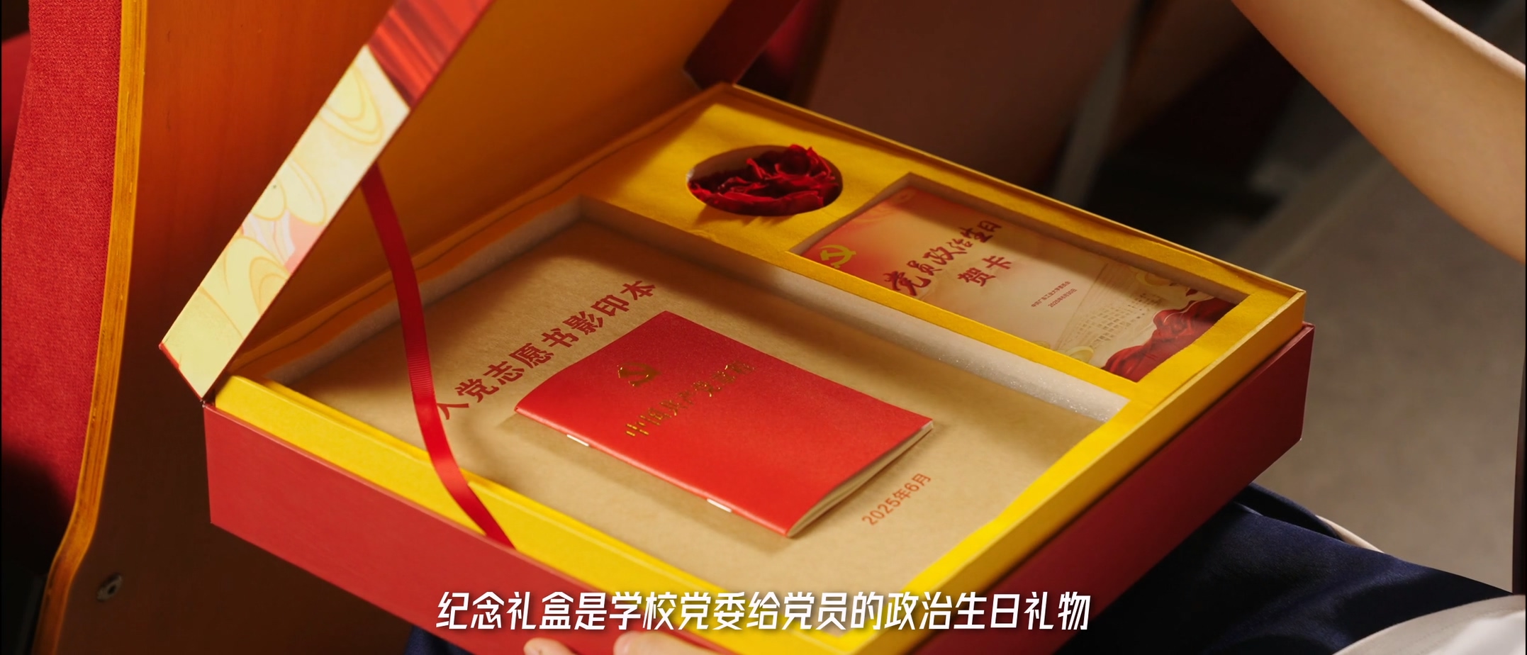 在“政治生日”仪式上,学校党委为党员送上纪念礼盒。政治生日贺卡写满了对党员的祝福和期望;《中国共产党章程》指引着党员始终牢记党的宗旨,严守党的纪律,用满腔热忱、实际行动展现共产党人的先锋本色;《入党志愿书》镌刻着党员政治生命的庄严起点,是其终身的信仰契约和行为镜鉴,时刻提醒着党员回望初心、勿忘誓言。