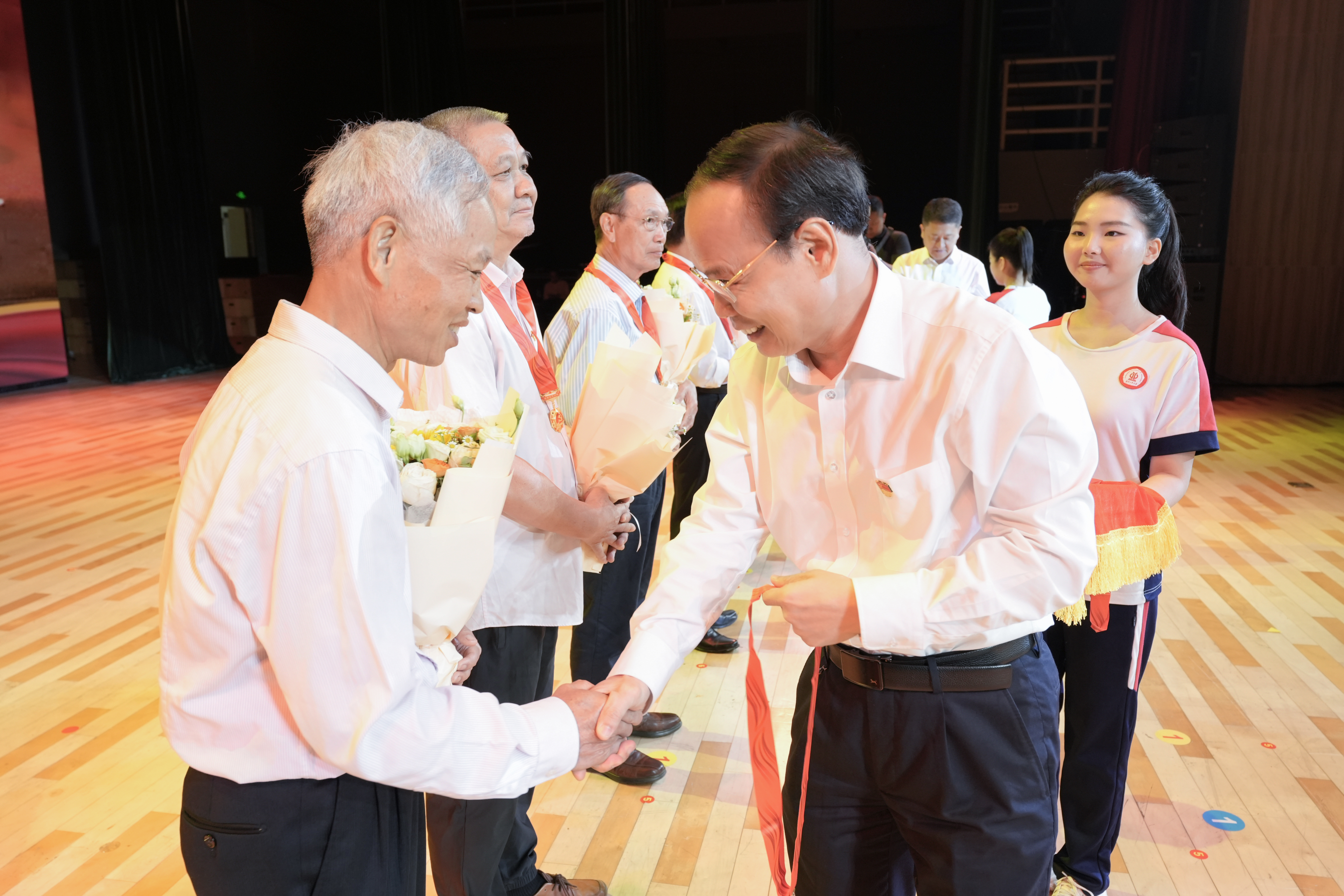 满头白发风霜染,一片丹心映初心。现场,学校党委书记白建刚,党委副书记、校长邱学青为刘大允、黄桂标、符志刚、杜秋虹、肖小亭、庄志强、何芳、韩素珍等8位老党员颁发“光荣在党50年”纪念章,学生党员为他们献上鲜花,致敬他们深厚的爱党情怀和奉献精神。台上台下共唱政治生日歌《三大纪律八项注意》,在歌声中传承优良作风,接好新时代党的接力棒。