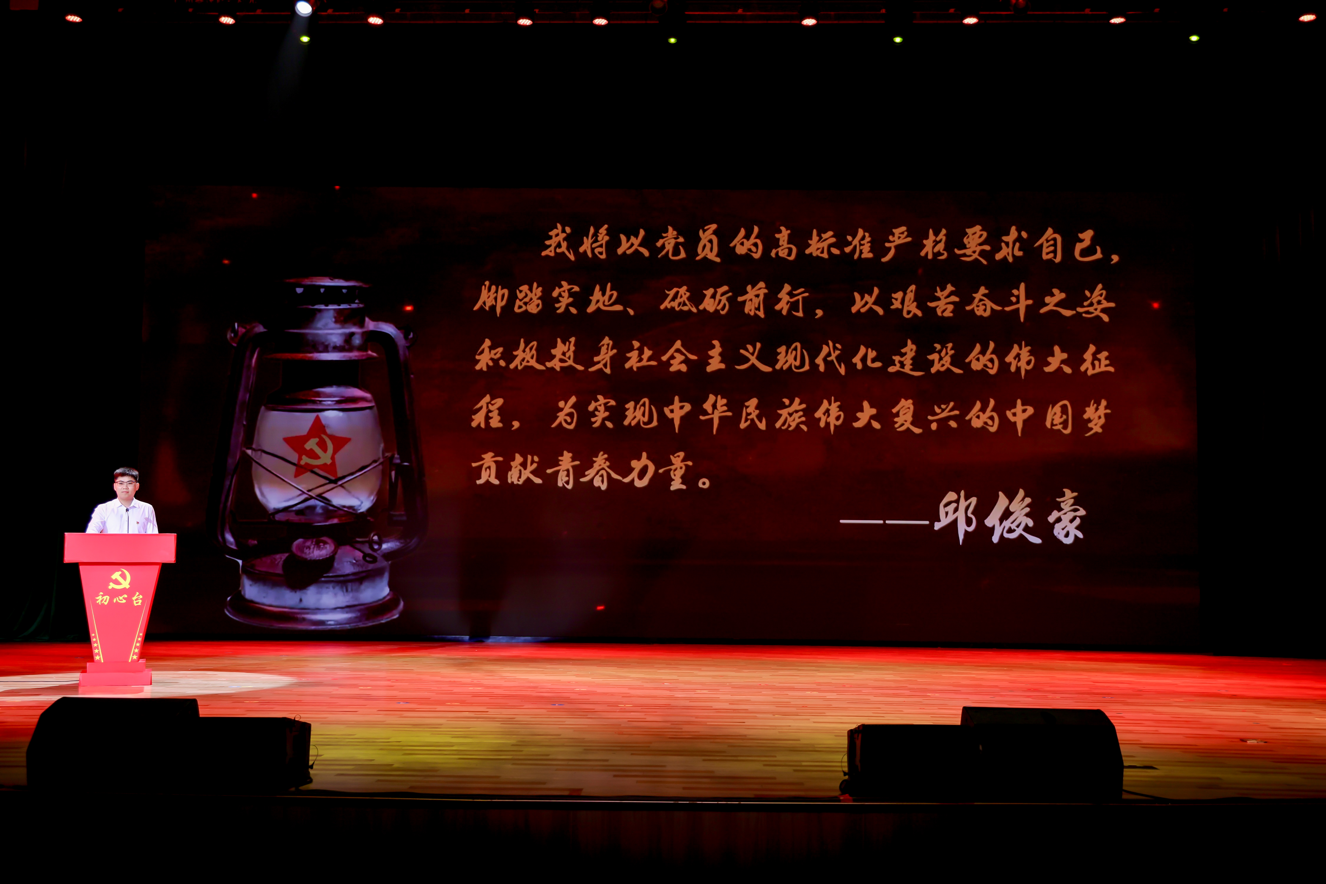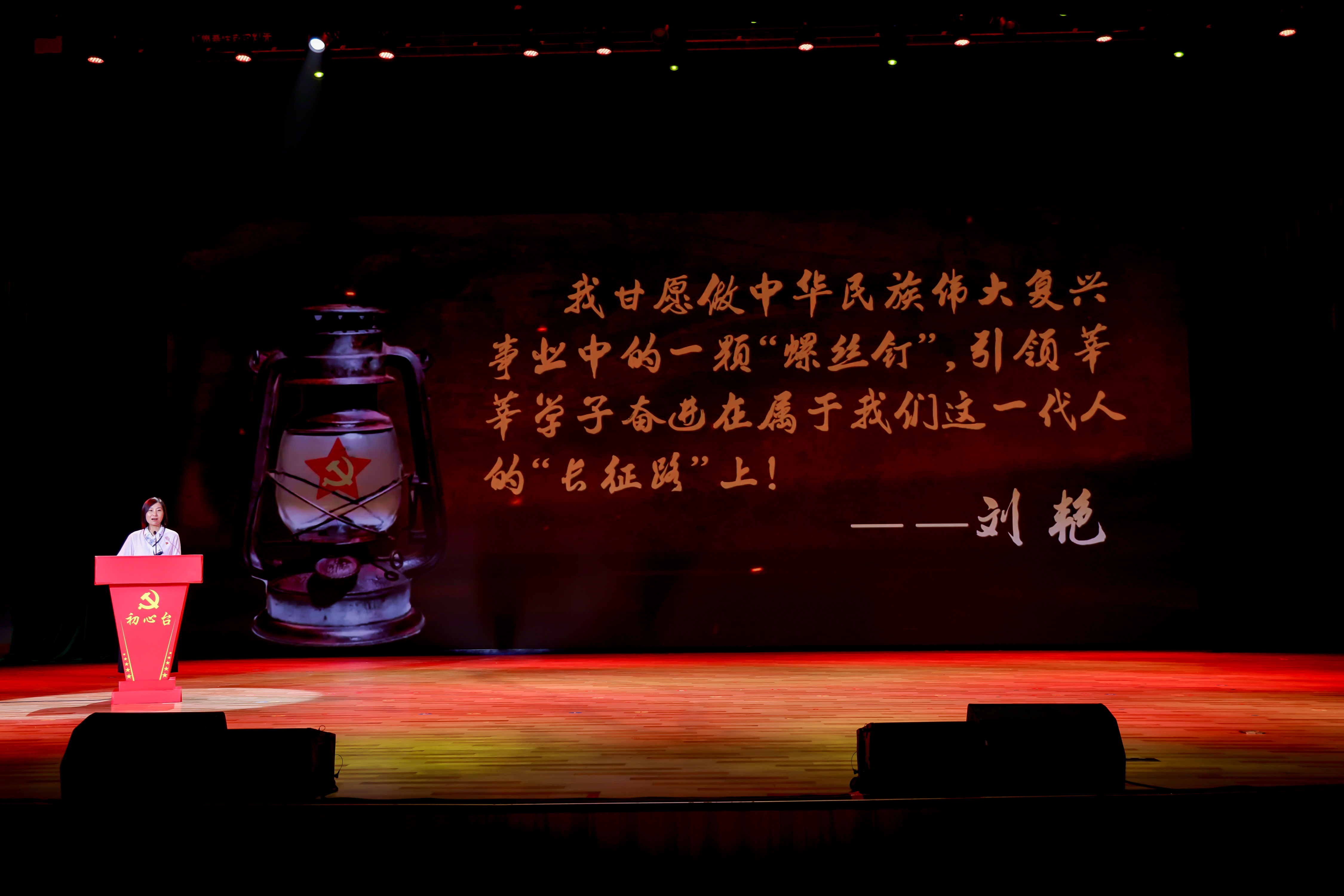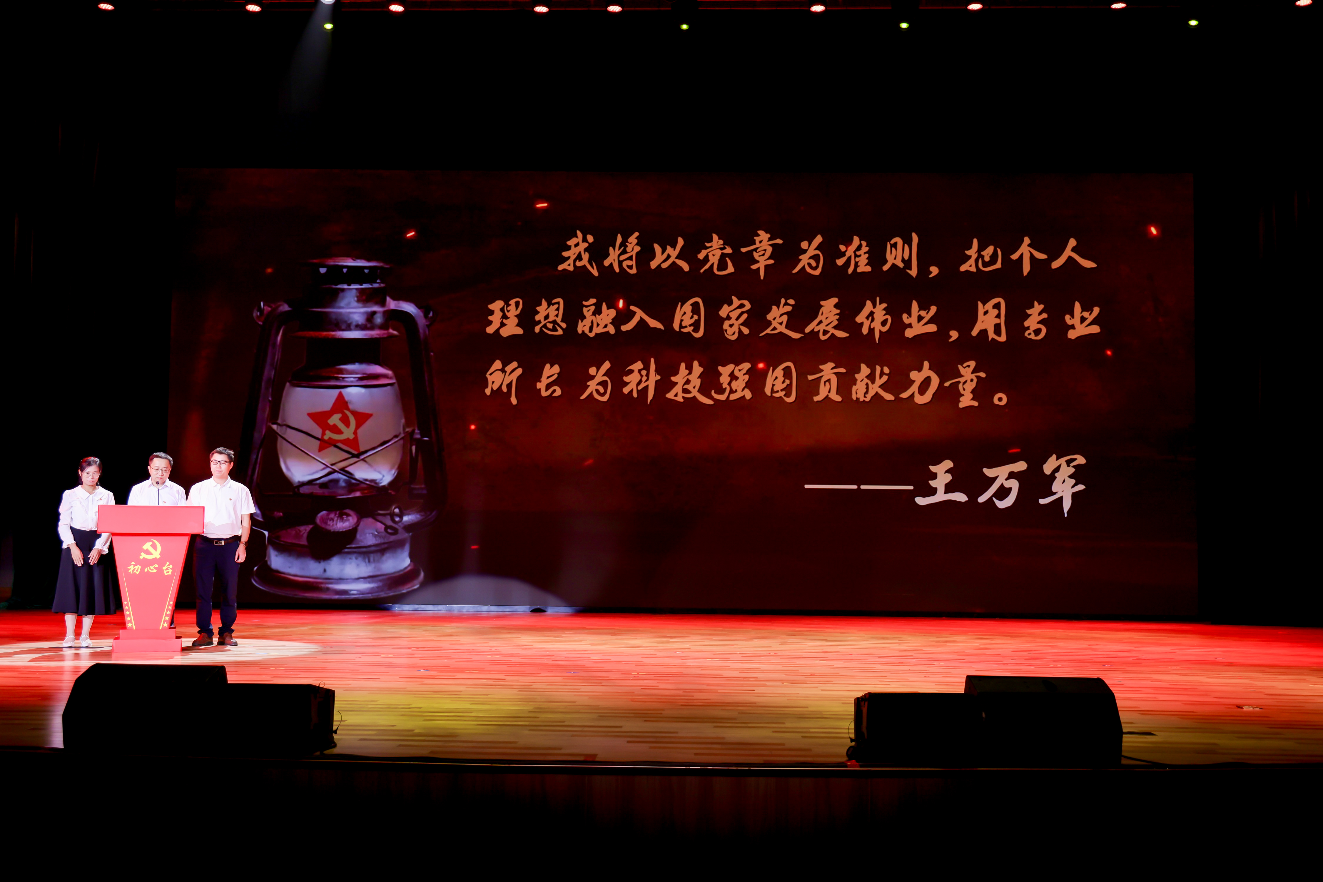 初心台上忆初心。全国党建工作样板支部、全国高校“双带头人”教师党支部书记“强国行”专项行动团队——环境科学与工程学院环境健康与污染控制研究院党支部副书记、教授王万军,轻工化工学院基础教学系教师党员、教授刘艳,机电工程学院机械工程专业2022级硕士研究生党员邱俊豪讲述了初心故事,走上初心台,深情朗诵了《入党志愿书》中的精彩片段,“我志愿加入中国共产党!请党考验我!”他们用掷地有声的话语,在党章上郑重印下的手印,和身体力行的实践,生动回答了“在党干什么、为党留什么?”,深情诠释了对党的忠诚。