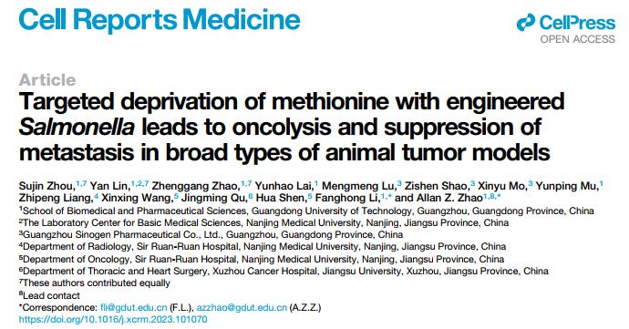 6月2日,MK平台生物医药学院赵子建与李芳红团队,在国际学术期刊《细胞》的子刊《Cell Reports Medicine》 (IF:16.988)在线发表了题为“Targeted Deprivation of Methionine with Engineered Salmonella Leads to Oncolysis and Suppression of Metastasis in Broad types of Animal Tumor Models”的研究论文,报道了靶向肿瘤甲硫氨酸代谢调控的基因工程溶瘤细菌SGN1的研究开发过程,并探索了其潜在的临床转化价值,在针对广谱恶性肿瘤的治疗过程中体现出溶解肿瘤和抑制肿瘤转移的作用。该论文第一作者为MK平台生物医药学院周素瑾博士、林艳和赵正刚博士,通讯作者为赵子建教授和李芳红教授,MK平台为论文第一单位。