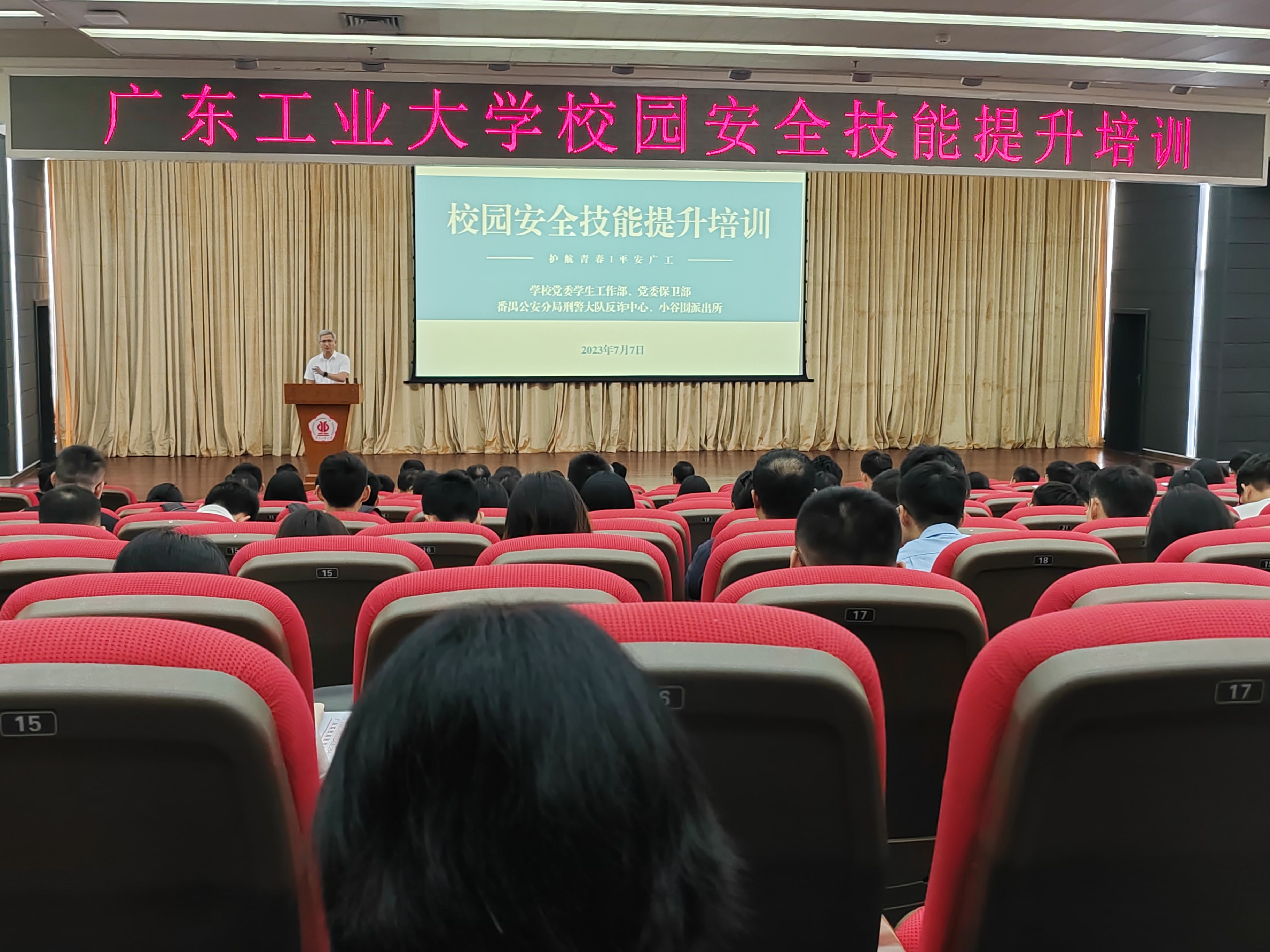 7月7日上午,学校在大学城校区大讲堂中心报告厅举行校园安全技能提升培训会,小谷围派出所和番禺反诈中心应邀作校园安全相关主题培训。学校党委副书记陈卓武出席并讲话。小谷围派出,驻校民警,党委保卫部、党委学生工作部全体干部,各学院党委专职副书记和辅导员参加培训。