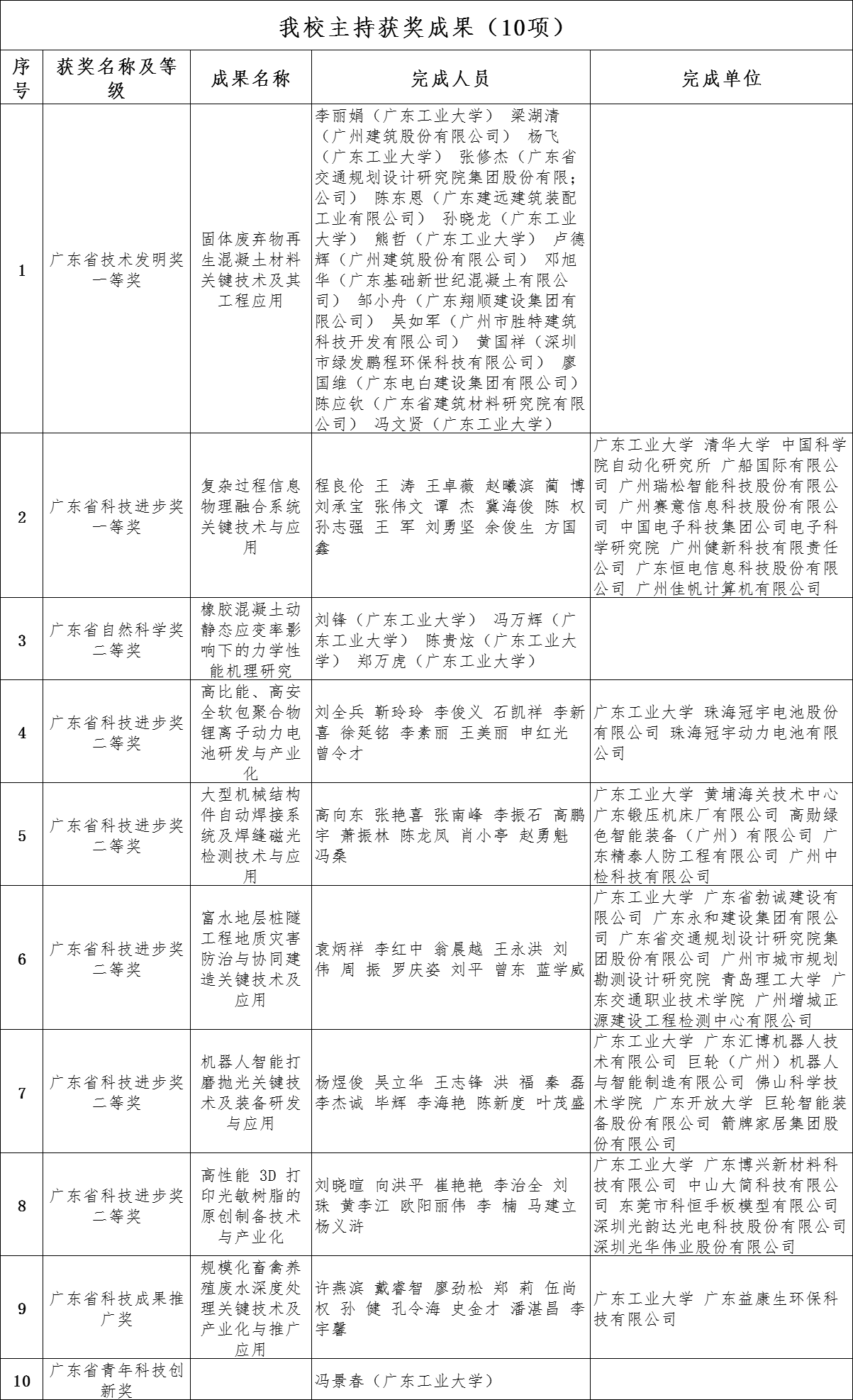 李丽娟教授主持的科研成果“固体废弃物再生混凝土材料关键技术及其工程应用”获技术发明一等奖;程良伦教授主持的科研成果“ 复杂过程信息物理融合系统关键技术与应用”获科技进步一等奖。冯景春教授获青年科技创新奖,许燕滨教授团队主持的科研成果“规模化畜禽养殖废水深度处理关键技术及产业化与推广应用”获科技成果推广奖。