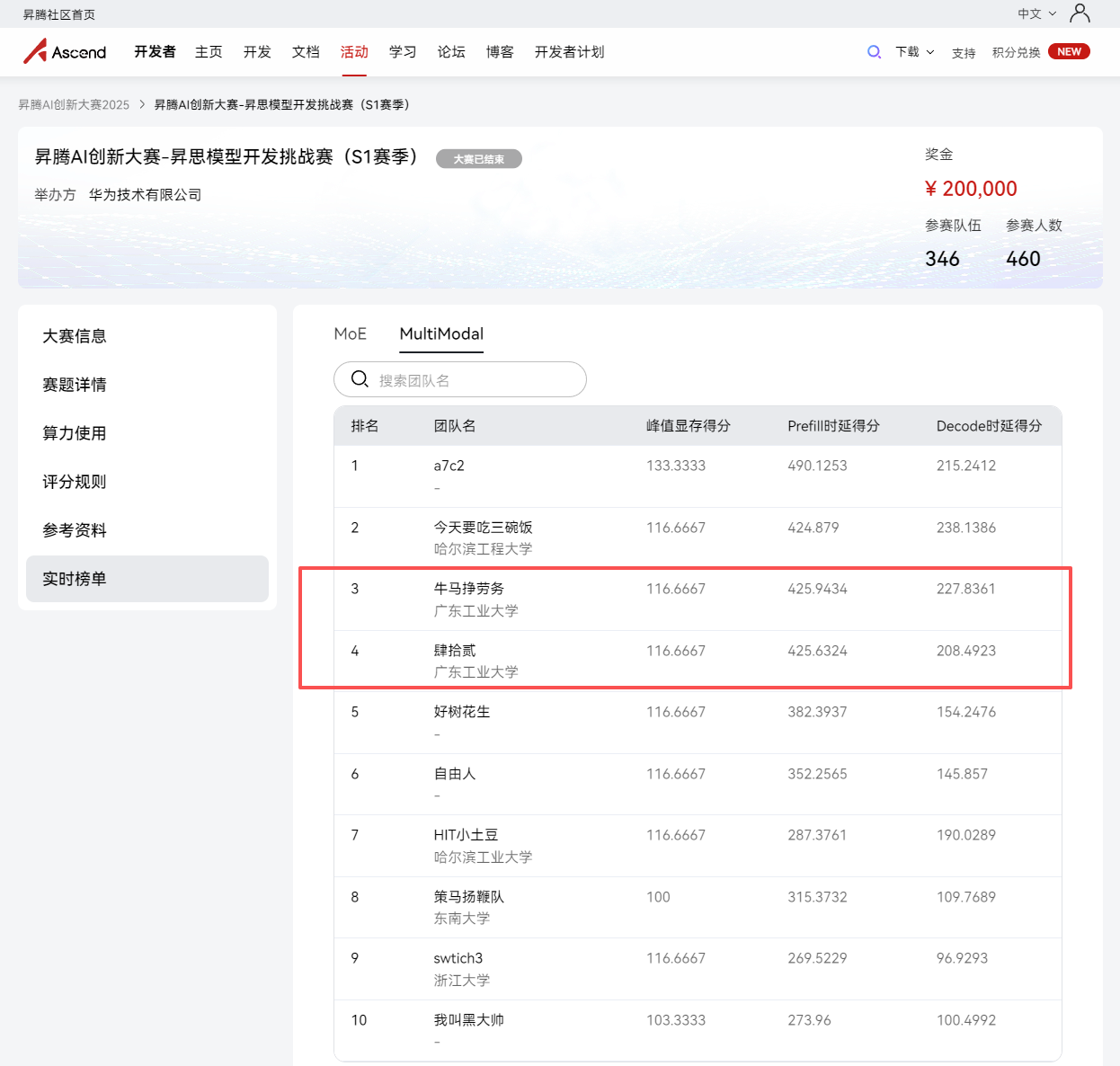 11月14日,2025年昇腾AI创新大赛-昇思模型开发挑战赛(S1赛季)赛事角逐圆满落幕。MK平台-华为“鲲鹏&昇腾开发者创享社”(以下简称创享社)的参赛学子,与来自浙江大学、哈尔滨工业大学、北京航空航天大学、西北工业大学等全国知名高校、科研机构、企业单位的346支顶尖队伍同场竞技,以扎实的技术实力在这场AI领域的巅峰对决中强势突围,斩获佳绩。康俊熙同学获多模态赛道全国第3名(全国银奖),李文豪同学获多模态赛道全国第4名(全国铜奖),沈权猷同学获moe赛道全国第6(全国铜奖)。