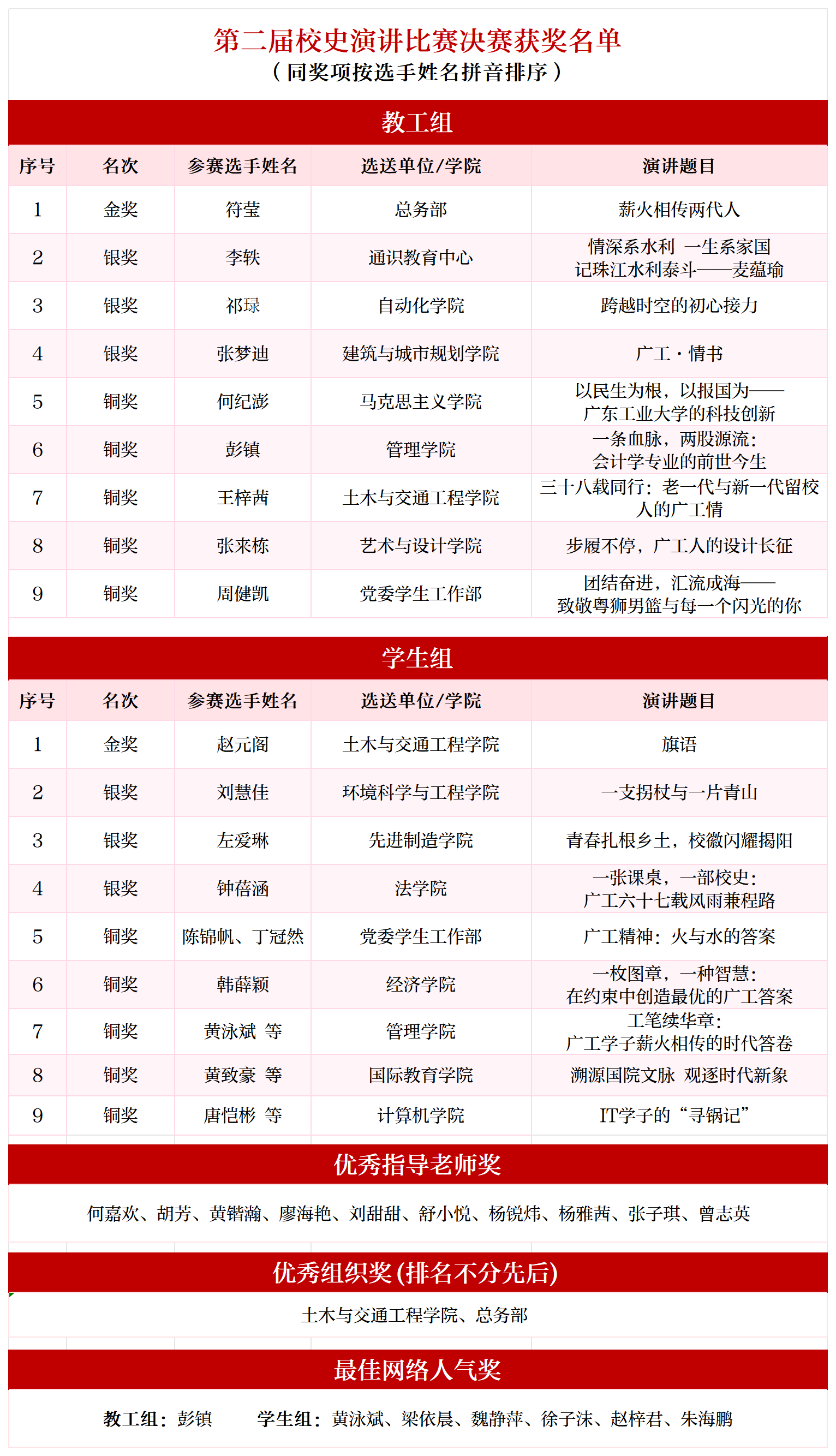 决赛评选出教工组、学生组金奖各 1 名、银奖各 3 名、铜奖各 5名,同时颁发最佳网络人气奖、优秀指导教师奖、优秀组织奖等奖项。