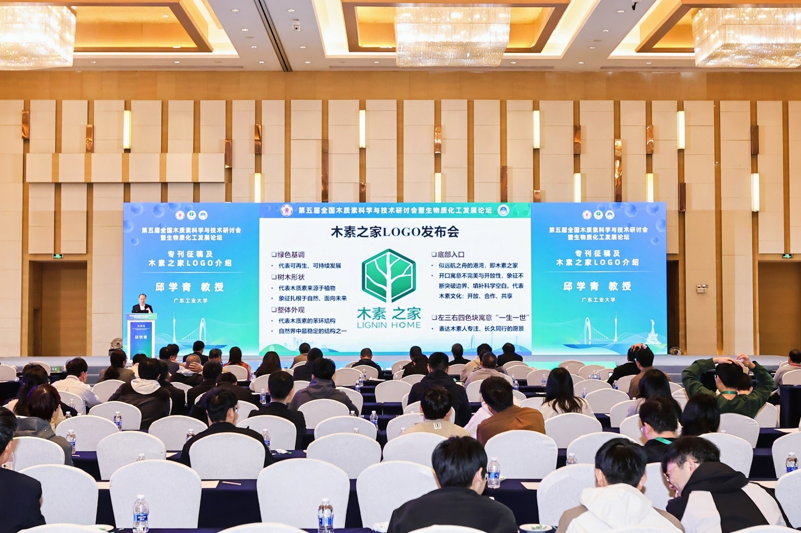 闭幕式上,邱学青发布了木质素研究者共同的“木素之家”LOGO,其设计融合苯环结构、树木形态与绿色基调,象征 “开放、合作、共享” 的学术文化,底部入口寓意突破科学边界,左三右四色块传递 “专注同行” 的愿景。邱学青强调,木质素的高值化利用仍任重道远,呼吁全国同行加强协作,聚焦关键核心技术攻关,共同推动我国木质素科学与技术迈向更高水平,为生态文明建设与可持续发展贡献智慧与力量。