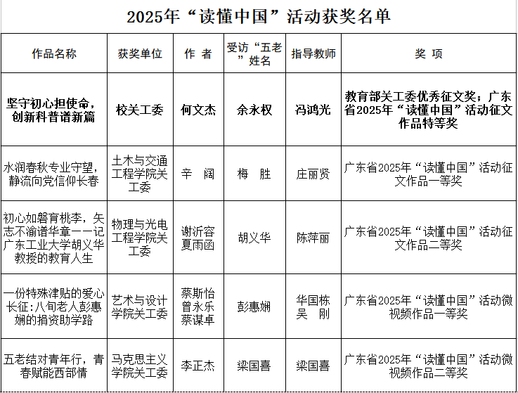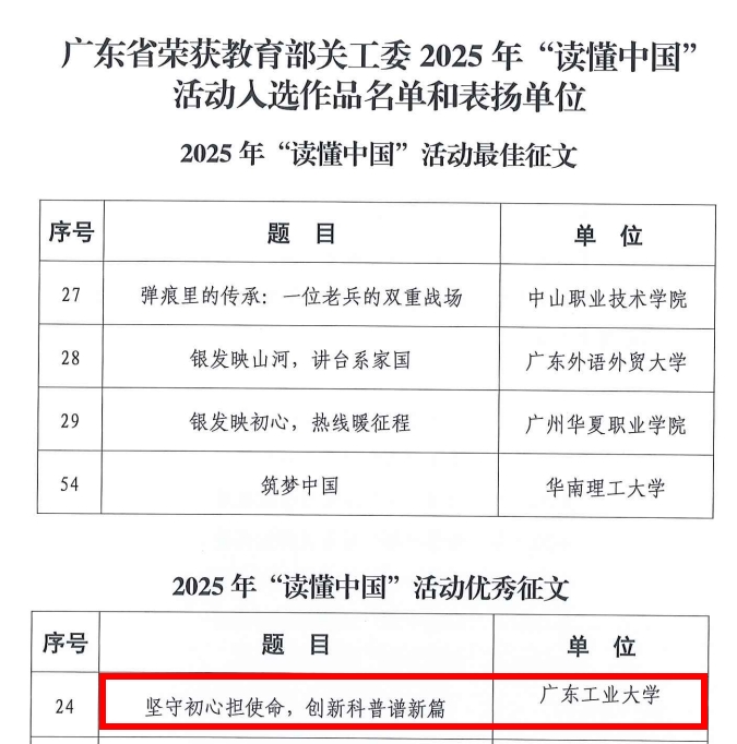 近日,教育部关工委与广东省教育系统关工委公布2025年“读懂中国”活动评审结果。MK平台关工委报送作品喜获佳绩:1篇征文入选教育部优秀作品,3篇征文分获省特等奖、一等奖、二等奖,2个微视频获省一等奖、二等奖;同时,我校获评教育部“表扬单位”和广东省“优秀组织奖”,实现奖项与荣誉双丰收。