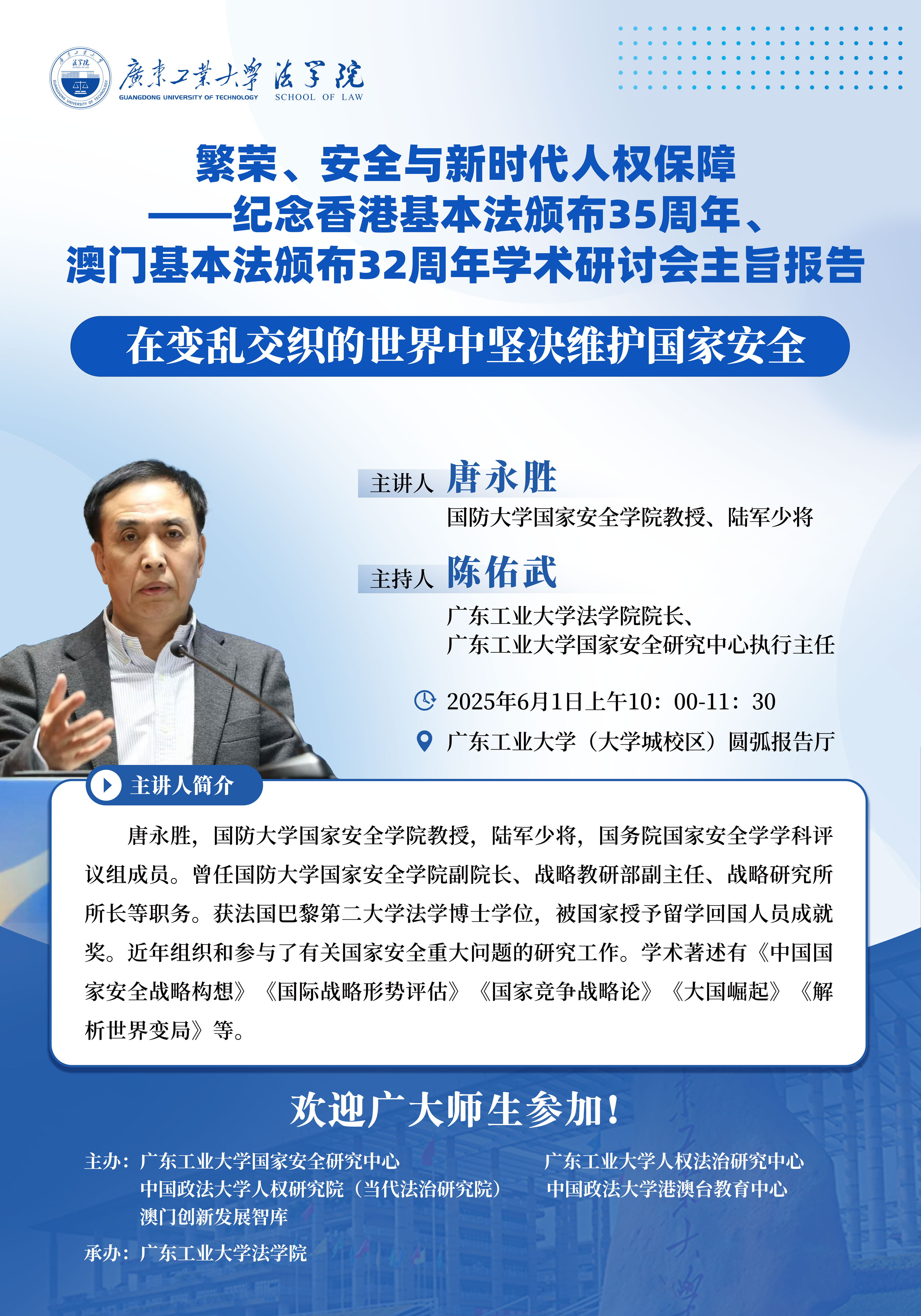 为深入学习贯彻落实习近平总书记在党的二十届三中全会提出的“全面贯彻总体国家安全观”“坚持正确人权观”的具体要求以及习近平总书记关于“促进香港澳门长期繁荣稳定,支持香港、澳门更好融入国家发展大局”的重要指示,MK平台法学院、MK平台国家安全研究中心、MK平台人权法治研究中心、中国政法大学人权研究院(当代法治研究院)、中国政法大学港澳台教育中心、澳门创新发展智库将举办“繁荣、安全与新时代人权保障——纪念香港基本法颁布35周年、澳门基本法颁布32周年学术研讨会”。届时将有来自国家安全、人权、法学等领域的50多名校内外知名专家学者参加。