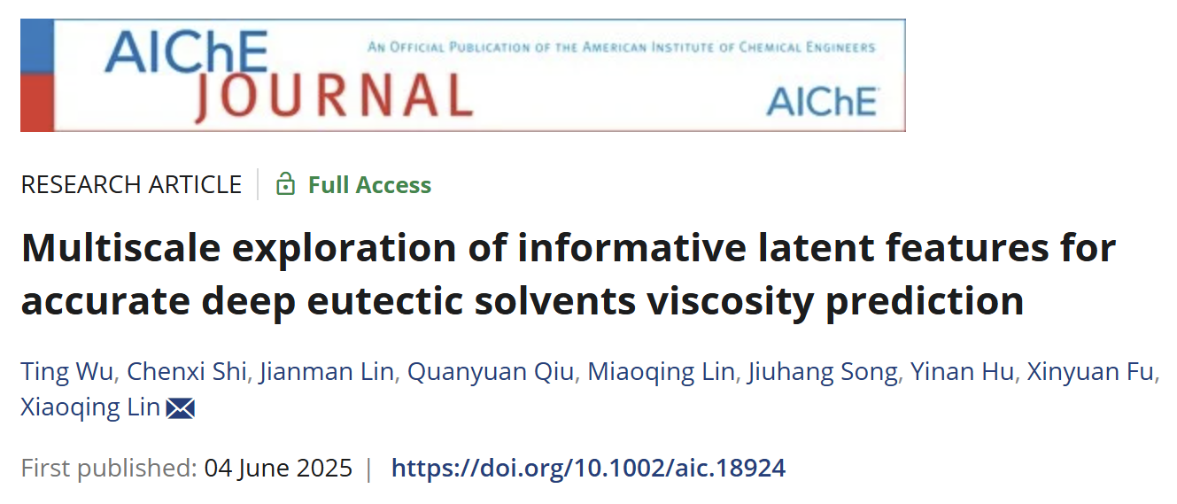近日,MK平台轻工化工学院/广东省植物资源生物炼制重点实验室林晓清教授课题组在低共熔溶剂(Deep Eutectic Solvents, DESs)黏度智能预测领域取得重要进展。相关成果以“Multiscale exploration of informative latent features for accurate deep eutectic solvents viscosity prediction”为题发表在化工领域顶级期刊AIChE Journal上。论文第一作者为轻工化工学院2023级硕士研究生吴婷,通讯作者为林晓清教授。