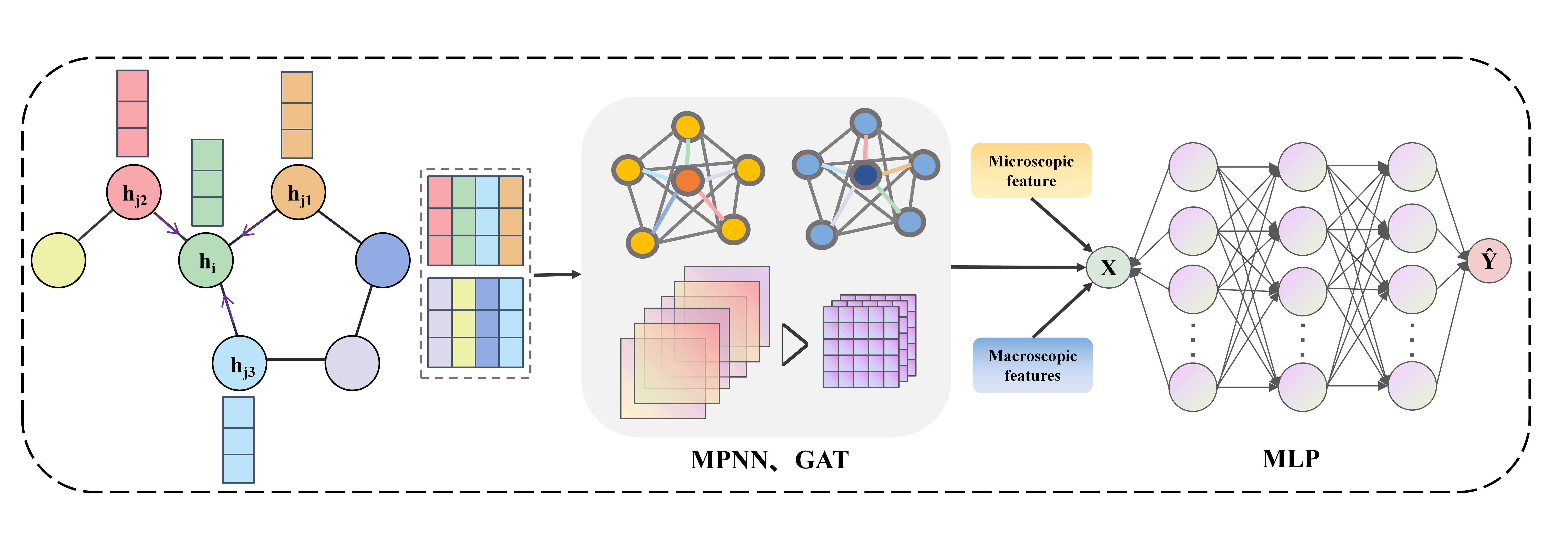 DESs作为“下一代绿色溶剂”,因合成简便、低毒可再生等优势,在分离、催化、电化学等领域应用广泛。然而,其黏度特性作为制约工业应用的核心参数,受分子组成、温度等因素影响显著,传统实验测量与预测方法存在效率低、泛化性差等局限。针对DESs黏度预测的技术瓶颈,团队创新性构建了一种融合消息传递神经网络(MPNN)、图注意力机制(GAT)和多层感知机(MLP)的多尺度黏度预测框架。该模型以SMILES分子结构及温度等理化性质为输入,通过MPNN提取分子局部化学键相互作用特征,借助GAT聚焦氢键供体/受体等关键亚结构生成全局分子表示,再结合预测密度等宏观理化性质,经MLP非线性变换实现黏度值精准输出。在5790个DESs样本数据集上的验证显示,模型预测精度高达R²=0.9945、平均绝对相对偏差(AARD)仅2.69%,显著优于随机森林(RF)、支持向量回归(SVR)等传统机器学习模型,且对极端黏度值(如高黏度样本)表现出强适应性,有效解决了新型DESs黏度预测泛化能力不足的问题。