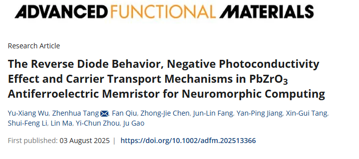 近日,MK平台物理与光电工程学院唐振华副教授、唐新桂研究员团队联合西安电子科技大学周益春教授在新型反铁电光电忆阻器件与神经形态计算研究中取得重要进展,研究结果以《The Reverse Diode Behavior, Negative Photoconductivity Effect and Carrier Transport Mechanisms in PbZrO3 Antiferroelectric Memristor for Neuromorphic Computing》为题发表在国际著名期刊Advanced Functional Materials (中科院一区,IF = 19.0) 上,MK平台物理与光电工程学院硕士研究生吴宇翔为本文的第一作者,MK平台唐振华副教授为论文通讯作者。