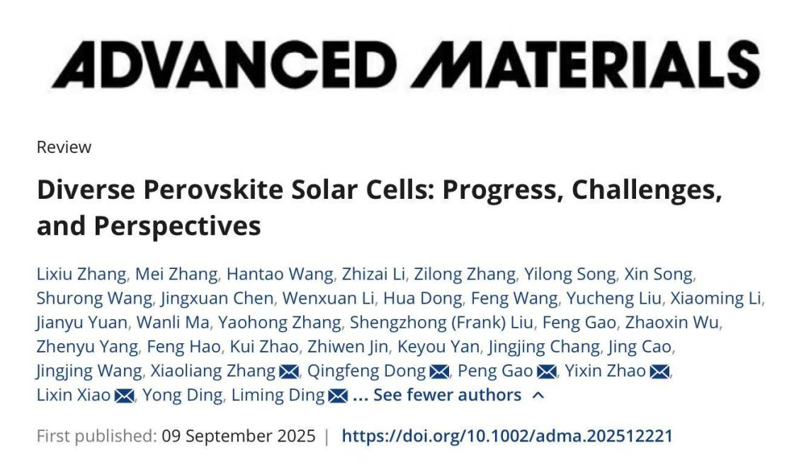 近期,我校轻工化工学院丁黎明教授团队在钙钛矿太阳电池研究领域取得新进展,其合作完成的综述论文《Diverse perovskite materials: progresses, challenges and perspectives》发表于国际高水平期刊《Advanced Materials》(中科院一区,IF=26.8)。该成果由我校丁黎明教授与北京航空航天大学张晓亮教授、吉林大学董庆锋教授、中国科学院福建物质结构研究所高鹏研究员、上海交通大学赵一新教授、北京大学肖立新教授等国内多家知名团队共同完成,体现了广泛的学术合作与影响力。