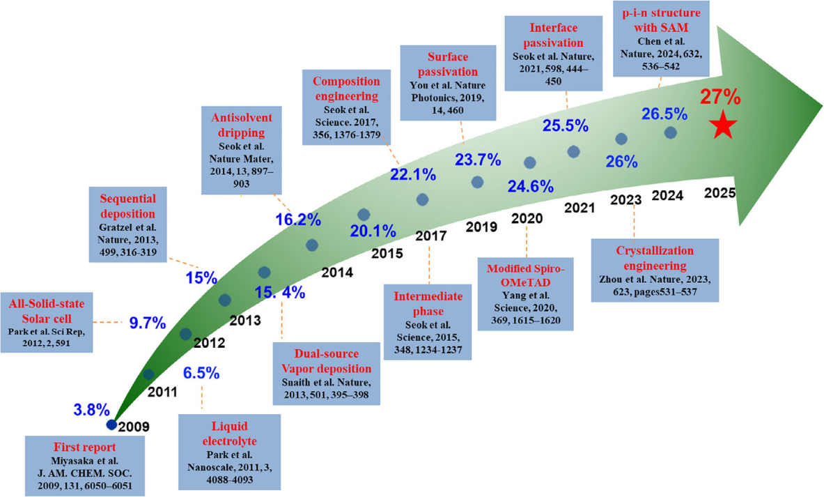 Figure 2. The efficiency improvement timeline for perovskite solar cells.