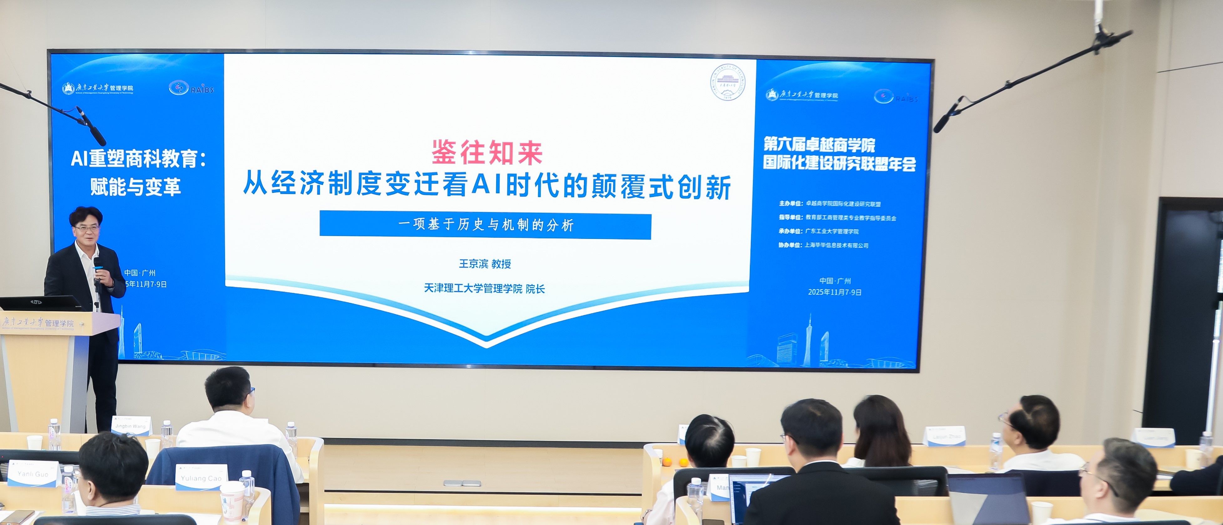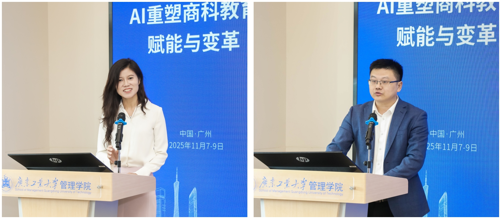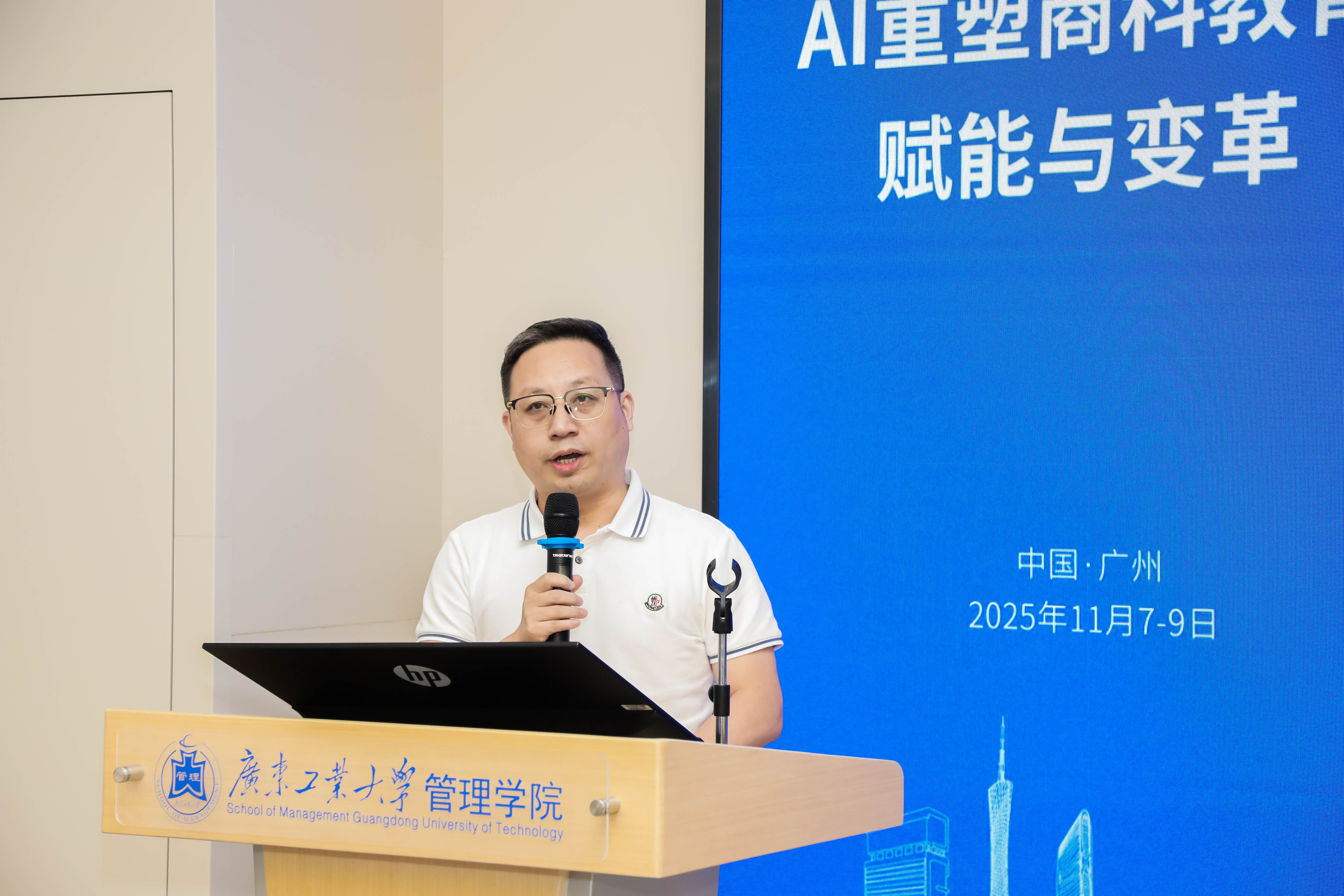 下午,广东外语外贸大学丁浩教授主持了主旨报告的第三部分。北京联合大学江晶晶教授从全球化-本土化的视角探讨了AI赋能商学院的发展路径;天津理工大学王京滨教授通过经济史和机制的分析提出通过经济制度转型探索AI时代的颠覆式创新;MK平台奚菁教授系统介绍了MK平台 MBA人才培养的“管工融合五星模式”创新与实践。