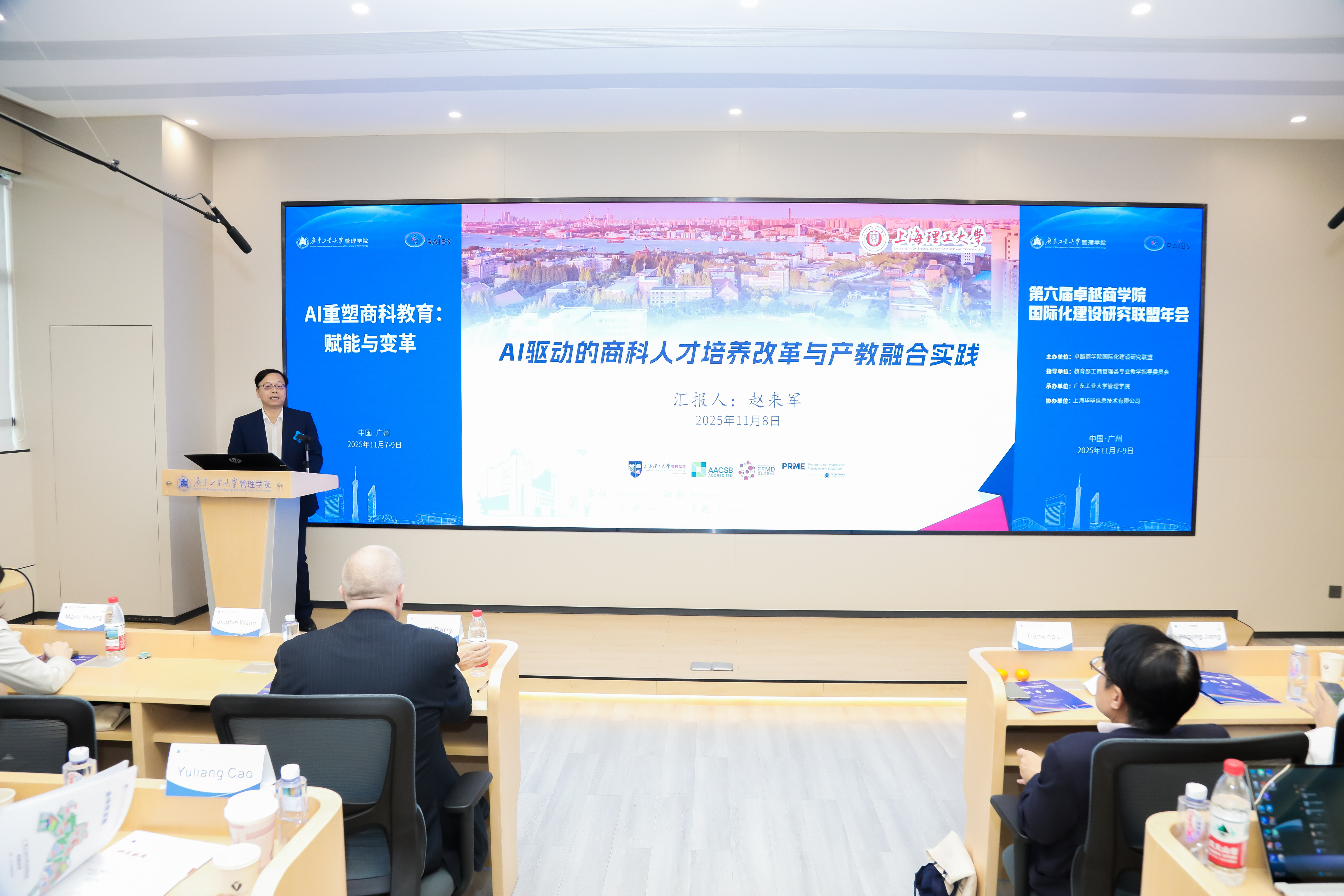 天津理工大学曹昱亮教授主持了主旨报告第四部分。上海理工大学赵来军教授介绍了上海理工大学管理学院以 “AI-SMART”模式构建AI与商科深度融合的人才培养体系;AACSB执行副总裁Geoff Perry教授以商科教育国际认证的视角系统分享了面对AI时代的挑战商科教育的破局与重塑。
