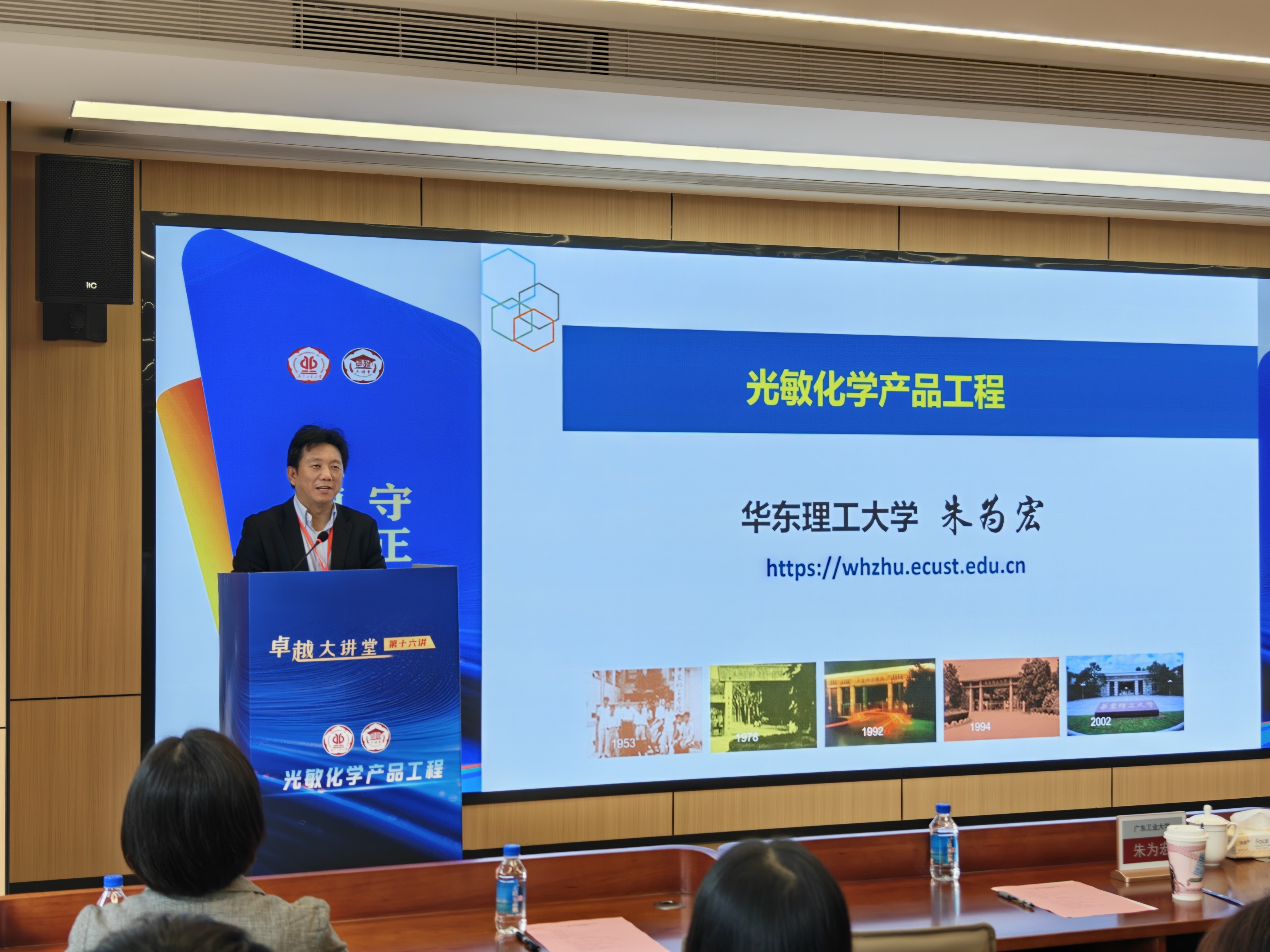 讲座上,朱为宏院士系统阐述了光敏化学这一化工新范式具有非接触、高精准、低功耗等独特优势,并重点分享了团队在三个层面的创新成果:在基础研究方面,提出染料第二排液模型,开发双亲性共聚物材料,突破有机半导体迁移率瓶颈;在过程强化方面,采用多通道涡流设备和AI高通量筛选,实现材料形貌精准控制和研发效率提升;在产品应用方面,开发出光致变色分子、新型防伪技术、智能节能玻璃等高端产品。