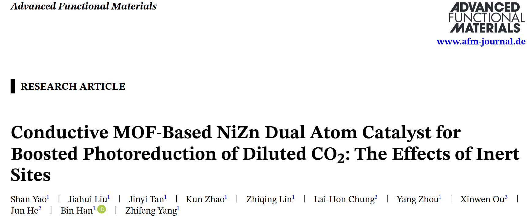 近期,我校生态环境与资源学院杨志峰院士团队韩彬教授课题组在人为源二氧化碳转化研究中取得重要进展,研究成果以“Conductive MOF-Based NiZn Dual Atom Catalyst for Boosted Photoreduction of Diluted CO2: The Effects of Inert Sites”为题发表于《Advanced Functional Materials》。韩彬教授为论文通讯作者,生态环境与资源学院博士后姚杉及2025届硕士研究生刘家慧为论文共同第一作者。
